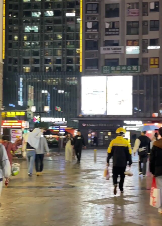 street scene at night. Pedestrians walk along a wet paved surface, likely after rain, their reflections visible in the wet ground. Buildings with illuminated windows flank the street, and a large digital billboard displays an advertisement above a COTTI COFFEE shop. A man in a yellow and black jacket walks away from the camera, carrying what appear to be groceries. Others walk in various directions, some carrying shopping bags. The light from the buildings and signs illuminates the street, creating bright reflections on the wet pavement. The overall atmosphere is bustling with activity despite the wet conditions.