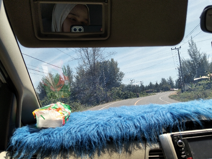 Inside a car, a selfie is reflected in the sun visor mirror. The dashboard is covered with a bright blue furry material, atop which sits a package of tissues. Through the windshield, a winding asphalt road stretches into the distance under a bright sky. Utility poles line the road, and trees dot the landscape. The scene evokes a sense of travel.