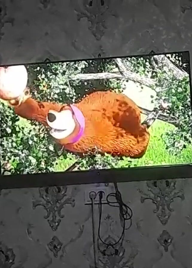 - "A television mounted on a wall with ornate wallpaper is playing an animated cartoon, "Masha and the Bear" by FM-0iPNo2, licensed under CC BY 4.0