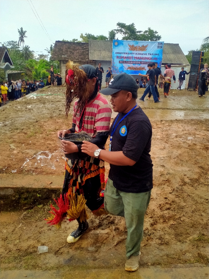 An outdoor event is depicted in Desa Ganten, Ganten, Indonesia, under an overcast sky, with the ground extensively covered in wet, uneven mud
