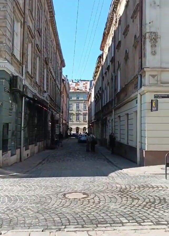 The camera stands at the edge of a paved intersection leading into a narrow street lined with old buildings