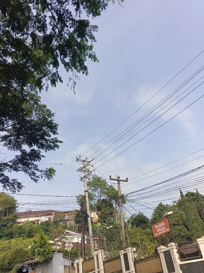 The image depicts an upward-angle view of a residential hillside under a clear blue sky with sparse white clouds. The scene is located in what is identified as the city of Unknown, Cambodia, though a prominent sign displays text in Indonesian. In the upper left quadrant, dense green foliage of a large tree partially obscures the sky. The upper right and central portions feature a light blue sky with faint cloud cover; a small crescent moon is subtly visible towards the center-right. Two utility poles stand prominently in the mid-ground, slightly right of center. The left pole is a concrete structure equipped with multiple cross-arms supporting numerous power lines and insulators. The right pole, appearing to be of wood or concrete, has a single cross-arm and fewer electrical wires. A dense network of black electrical cables crisscrosses the sky, connected to these poles and extending across the frame. The mid-ground and background showcase a lush green hillside covered with trees and dense vegetation. Several residential buildings with red-tiled roofs are nestled into the hillside. Closer to the foreground, parts of white-painted walls and roofs of additional structures are visible among the foliage. In the lower right, a segment of a light-colored concrete and dark metal fence or wall is present, with the number "31" visibly embossed on a fence post. Above this fence, a rectangular red sign with white text is affixed. The sign reads "DIJUAL VILLA" (Villa for Sale) and below it, "HUB: 081810782390" (Contact: 081810782390), indicating the text is in Indonesian. A small portion of a person's head, wearing a dark helmet, is visible in the extreme lower-left corner of the frame. No specific actions or interactions are discernible. The overall environment suggests a suburban or semi-urban residential area on a slope, with a significant amount of green space and established utility infrastructure. The lighting suggests daytime.