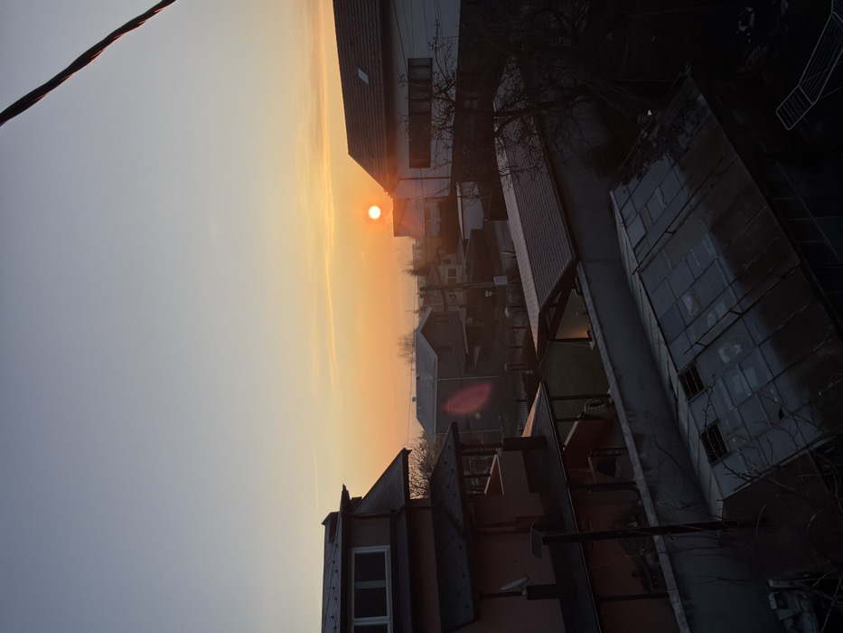 The image presents an elevated view of a residential area within Sofia, Bulgaria, at either sunrise or sunset. The sky transitions from light blue at the top to a warm orange and yellow gradient near the horizon, where a distinct, bright orange sun is visible. In the left foreground, a two-story house with a peach-colored facade and a dark brown tiled roof features multiple windows and a covered lower-level porch. White accumulations, consistent with snow or frost, are present on portions of its roof. A satellite dish is mounted on this structure, and a dark street lamp post stands adjacent. To the right, a second prominent house with a white facade and a reddish-brown tiled roof, including an attic window, is partially visible. Further down, a greenhouse-like structure with a metal frame and reflective panels occupies the lower section of the frame, with a white, collapsible clothes drying rack visible in the bottom right corner. Multiple detached houses with varying roof styles extend into the mid-ground and background, separated by fences. Sparse, leafless deciduous trees are interspersed among the properties. A thick black power line or cable traverses the upper right corner of the frame diagonally. The scene is illuminated by warm, low-angle light, casting shadows, and a slight atmospheric haze is present near the horizon. No individuals are observed within the scene.