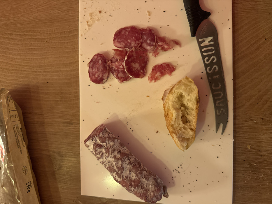 A white cutting board displays a variety of food items. Sliced and whole dry sausage are visible, along with a piece of bread. A knife with the word "SAUCISSON" cut out of the blade is positioned on the board. A sausage wrapper is partially visible to the left of the board. Small black flecks are scattered across the surface. The board is placed on a wooden surface.