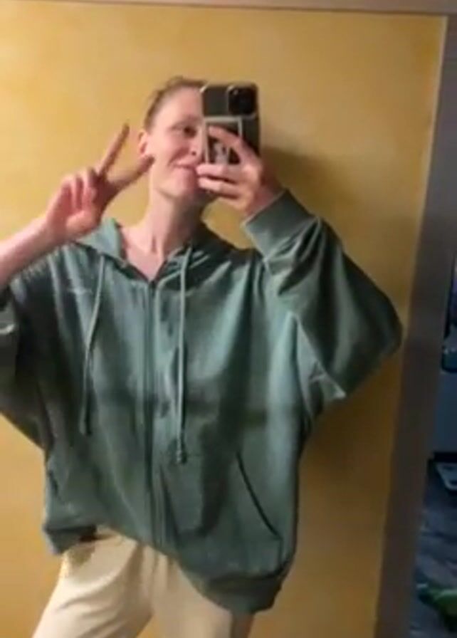 A slender young adult is standing in front of a bathroom mirror, recording a selfie video with an iPhone. She is wearing a light green, oversized zip-up hoodie and beige pants. The background is a pale yellow wall. Initially, she poses casually with one hand in her pocket. She then makes a peace sign with her free hand. Finally, she briefly steps to the side, and the camera focuses on the yellow wall.