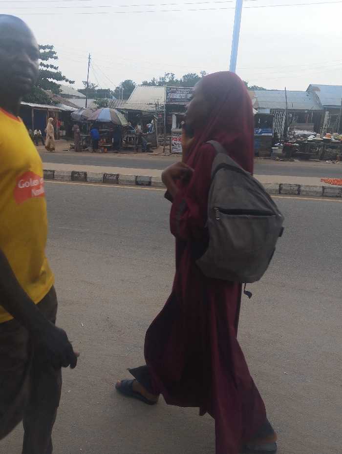 The scene depicts a street market in Zango-ndaji, Nigeria, under an overcast sky. In the foreground, two individuals are walking on an asphalt road. On the left, a partially visible dark-skinned male wears a yellow t-shirt with a "Gola & Nami" logo and dark trousers. On the right, a dark-skinned female walks towards the right, dressed in a maroon full-length garment and a matching hijab, carrying a grey backpack on her left shoulder and wearing dark sandals. Her right hand is raised towards her face. In the midground, the asphalt road features white and black striped markings, separating it from the market stalls. The background reveals a series of informal market structures constructed from corrugated metal, wood, and tarpaulins. Several people are visible within the market, some seated, others standing. One stall exhibits a multi-colored umbrella, and another features a sign partially legible as "POS SERVICES." Further right, red produce is displayed on a low surface. A wooden utility pole with overhead wires is present towards the left background. Distant vegetation is visible beyond the market, beneath a pale sky.