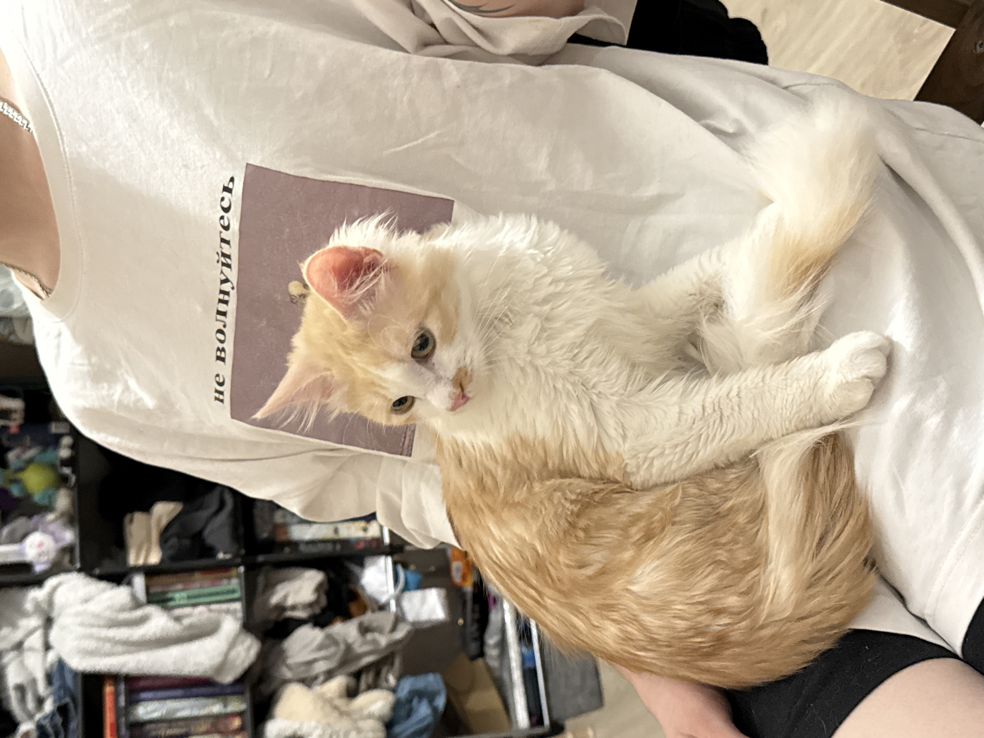 An indoor scene in Saint Petersburg, Russia, depicts a person holding a cat. The person is wearing a white short-sleeved t-shirt with the Russian text "не волнуйтесь" (meaning "don't worry") printed above an image of a cat's head. A silver-colored chain necklace is visible on the person's neck, and a tattoo is partially visible on the upper left arm. The person's lap is covered by black shorts, on which the cat is seated. The cat is a domestic medium-haired breed, predominantly light orange/ginger and white. Its fur is mostly orange on the back, head, and tail, with white on the face, chest, belly, and paws. The cat has green-yellow eyes, a pink nose, and is looking towards the left side of the frame. The background consists of a dark multi-shelf unit, densely packed with various items including books with visible spines, folded clothing (light grey and beige), and miscellaneous objects such as stuffed animals (a purple and a green one) on the top shelf. The flooring beneath the person is a light wood or laminate.