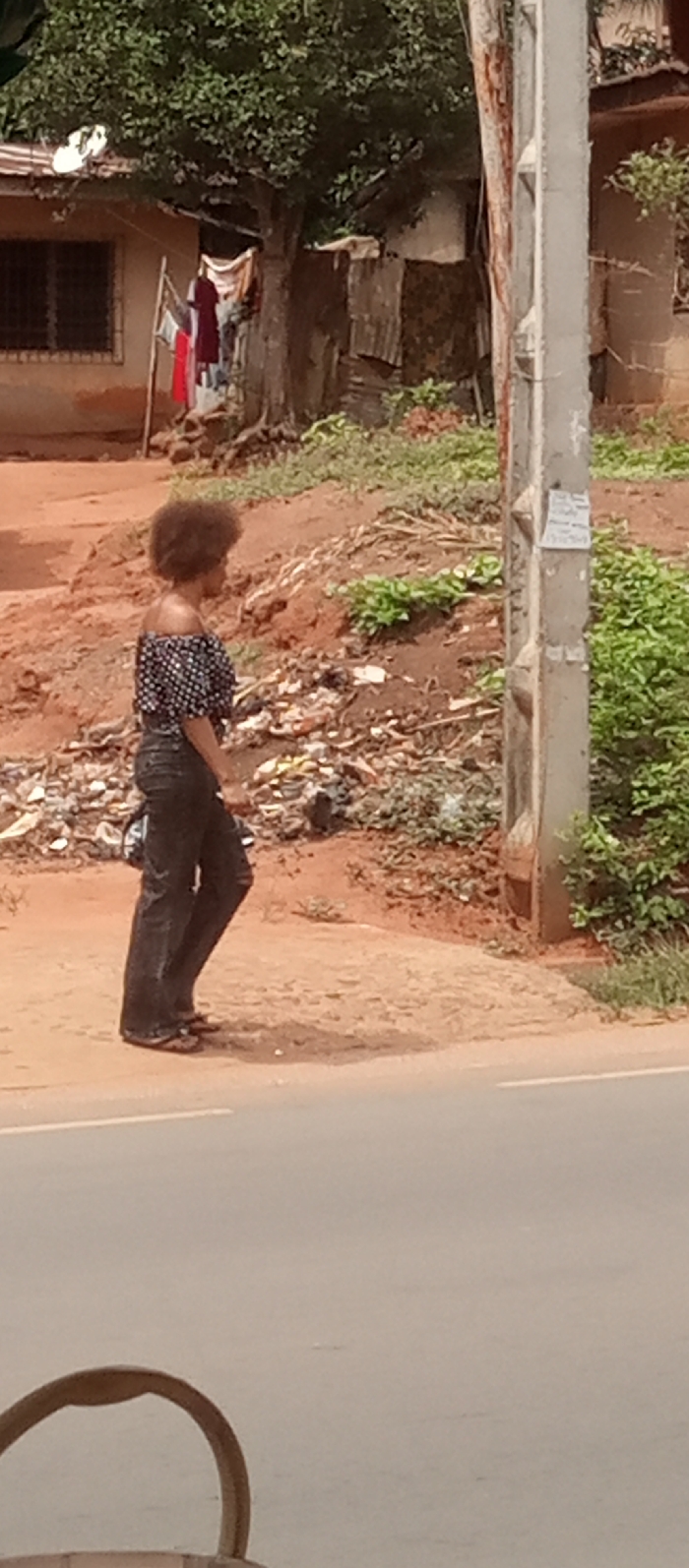 The image depicts a roadside scene in Nkpor, Nigeria. A dark-skinned female, observed in profile facing left, walks on a reddish-brown dirt path parallel to a light-grey asphalt road. She has dark, curly hair and wears a dark, off-the-shoulder polka-dot top with dark trousers and sandals. Behind her, the path slopes upwards into a bank of reddish-brown earth covered with scattered debris and sparse green foliage. In the background, on the left, a light-colored building with a barred window is partially visible, in front of which various clothes, including a red garment, hang on a line to dry. A large tree with dense green foliage stands behind this building. To the right of the tree, partially obscured by a grey utility pole, is a structure built from corrugated metal sheets and other materials. The utility pole stands upright on the right side of the frame, with green vegetation growing from the reddish-brown soil immediately to its right. A faint white line is visible on the asphalt road in the foreground. A partial view of a light-colored object with a curved handle is present in the extreme bottom left corner.