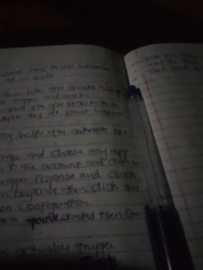 handwritten notes in a notebook, with a pen lying across the pages. The notes seem to be instructions or information, possibly related to software automation or triggers. The text includes phrases such as "choose any app," "trigger response," "configuration," and "actualize trigger." The lighting is poor, making the text somewhat difficult to read clearly.