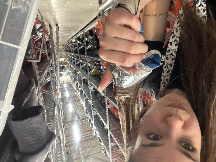 The image captures a young adult female in the left foreground of a large retail or warehouse interior in Sofia, Bulgaria. She has long brown hair and dark eyes, wearing a black top and a black and white panda-patterned lanyard. A tattoo reading "...yond blood." is visible on her right forearm. She holds a partially consumed chocolate bar, wrapped in silver and blue foil, in her right hand, her lips slightly pursed as she looks at the camera. The background consists of a long aisle bordered by tall, multi-tiered metal shelving units, extensively stocked with shoe boxes, many of which are identifiable as Nike brand due to their distinct orange and red packaging. Bright fluorescent lighting fixtures illuminate the high ceiling and the industrial-style floor. The environment suggests a Nike Factory Store or a large sporting goods retail outlet.