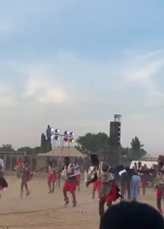 A group of men in traditional costumes are dancing in a dirt field under a partly cloudy sky. They are wearing red shorts, white vests with decorations, and headbands. There is a sound system and lighting equipment set up in the background. Several other people, including some wearing casual clothing, are present in the background, watching the dance. The camera is held by someone in the crowd, showing the top of their head in the foreground.