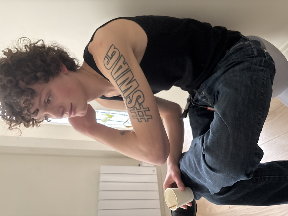 A young individual with curly brown hair and a contemplative expression is seated indoors, facing towards the left of the frame. The subject wears a black tank top, dark blue jeans, and a thin gold chain around the neck. A prominent outline tattoo of "#SWAG" is visible on the upper left arm. The left hand holds a white paper cup with a stirring stick, while the right hand is raised, supporting the chin. The subject's gaze is directed off-camera to the left. The background consists of light-colored walls, a white horizontal ribbed radiator on the left, and a window with a patterned glass pane providing diffuse natural light. The floor is light-colored wood. The interior elements, including the radiator and window architecture, are consistent with a residential apartment in Paris, France.