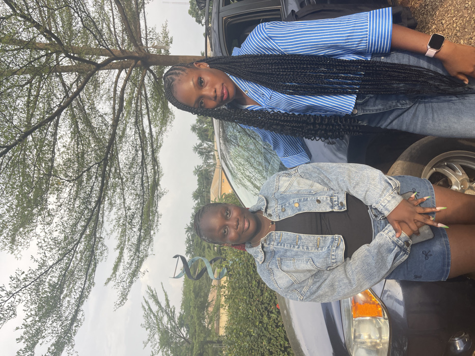 Two young Black women pose outside. The woman on top wears a blue striped shirt and jeans, with long braided hair. The other woman wears a black top and jean shorts, paired with a denim jacket. They stand beside a dark-colored car. Trees and a building can be seen in the background under a cloudy sky. The image is slightly rotated.