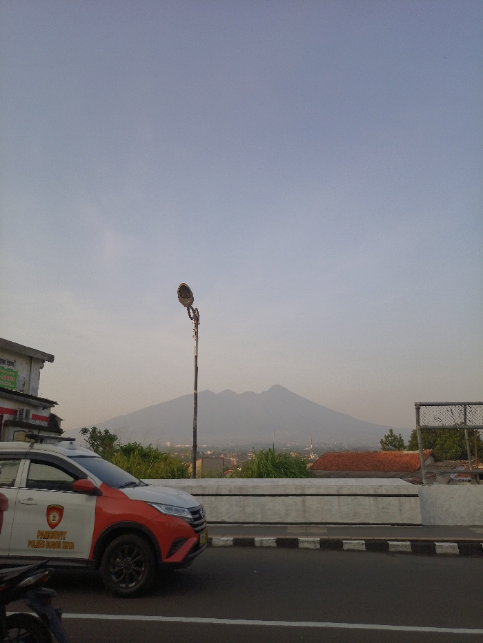 The image presents an urban landscape in Bogor, Indonesia, under a clear, hazy sky. In the immediate foreground, a white and orange patrol SUV, identified by "PATROLI POLISI BOGOR KOTA" text and a police emblem on its side, is partially visible on a paved road. A solid white lane line and a black-and-white checkered curb define the road's edge. A dark-colored motorcycle's front wheel is partially visible at the bottom-left corner. A low, light-colored concrete barrier extends horizontally across the midground. Behind this barrier, a dark street light pole with a circular fixture is centrally positioned. Beyond the barrier, the cityscape of Bogor is visible, comprising numerous buildings with visible red-tiled roofs, interspersed with green vegetation. The distant background is dominated by a prominent, multi-peaked mountain range, likely Mount Salak or Gede-Pangrango, rendered indistinct by atmospheric haze. A partial view of a multi-story building with a white facade and red trim is present on the far left, while a section of a wire mesh fence is visible on the far right.