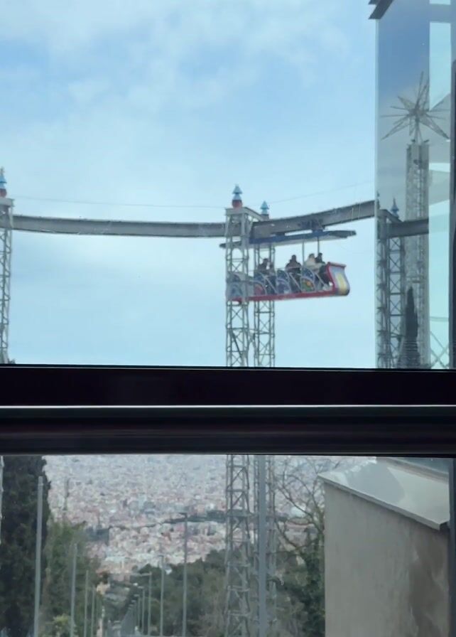 A video shows the view from inside a funicular going down a hill. The funicular car moves along a track with a cityscape in the background. Another ride, possibly a suspended swing ride, is visible outside. The view through the bottom of the car shows the funicular's wheels, the rails, and someone's feet in sneakers.