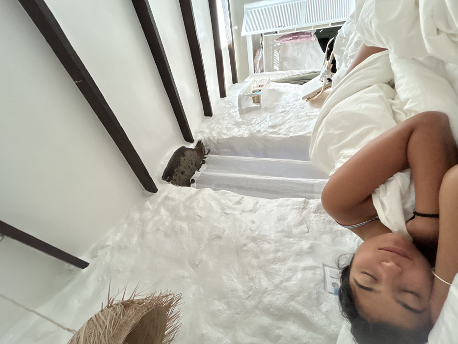 An individual is depicted sleeping on their side in an indoor setting within the city of Yaiza, Spain. The subject, a young adult female with dark hair and tanned skin, lies on her left side, eyes closed, appearing to be in a deep sleep. She is partially covered by white bedding, with a light-colored strap visible on her left shoulder. A silver-toned bracelet is on her left wrist, and a dark cord bracelet is on her right. Her head rests on a white pillow. The room features rough, white-textured walls, indicative of stone or traditional plasterwork. The ceiling is white with exposed dark brown wooden beams. In the upper right corner, an unplastered section of natural rock or stone is visible where the wall meets the ceiling. A white, ruffled fabric, possibly a curtain, hangs vertically beneath this stone section. On the far left, a woven straw or rattan lampshade hangs from the ceiling. A white electrical outlet with two sockets is visible on the lower left wall. In the background, to the right, an open white louvered bifold closet door reveals clothes hangers and garments. Above the closet area, white floating shelves hold various items. The lighting is soft and even throughout the scene.