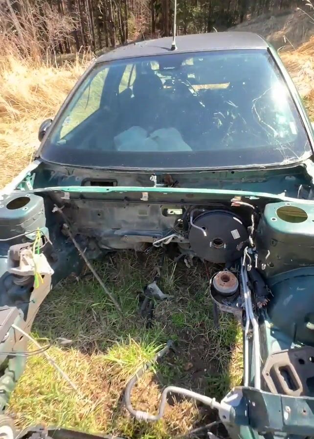 stripped-down green car chassis sitting in a grassy field near a wooded area. The car's front and rear sections have been removed, leaving the central cabin area and parts of the suspension exposed. Components like brake parts and wiring are visible. The surrounding environment includes green grass, brown vegetation, and pine trees in the background under a sunny sky.