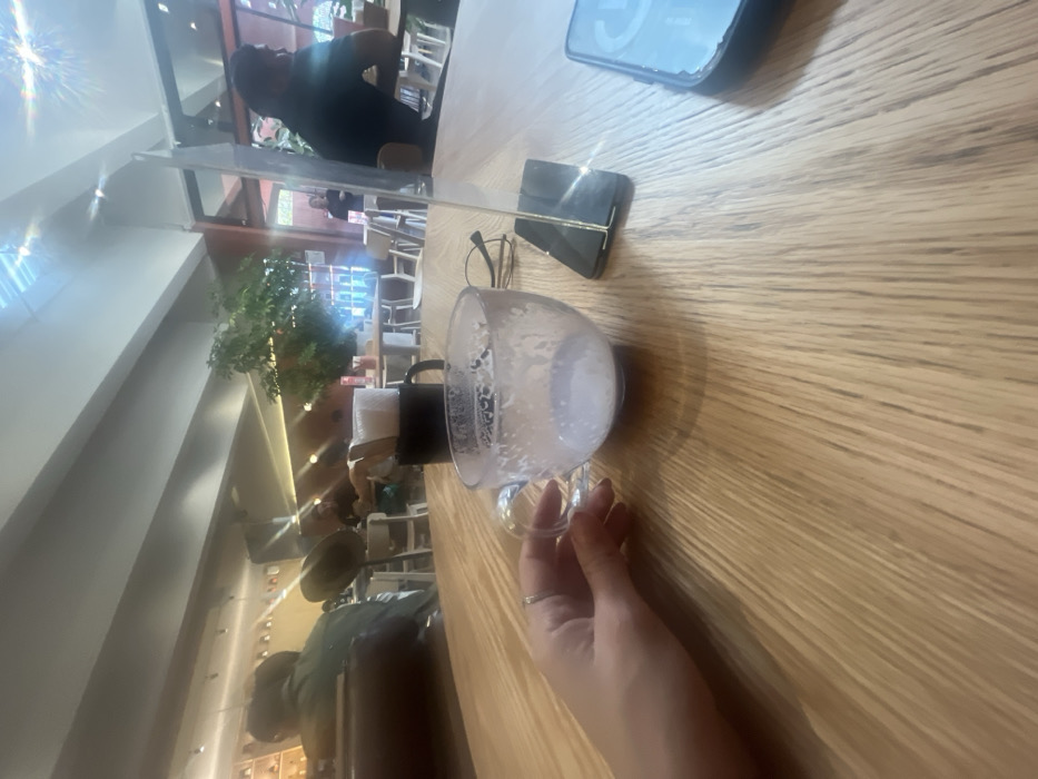 A partial view of a restaurant interior is depicted with a wooden table as the focal point. A glass containing residual liquid sits on the table, near a pair of glasses and a phone holder. A hand is seen holding the glass stem. In the background, a man stands near the window, with other patrons visible in the blurred interior, next to a decorative plant.