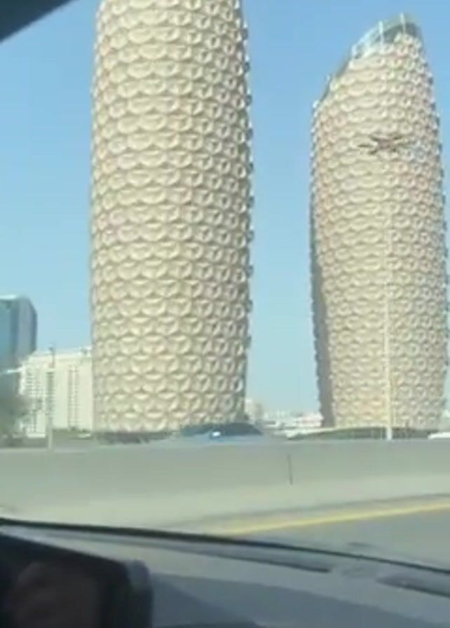 view from inside a car traveling on a highway, with two tall, cylindrical buildings in the background. The buildings have a unique, patterned exterior with repeating geometric shapes. Other buildings are visible in the distance behind the cylindrical structures. The sky is blue, and the sun is shining, creating a bright, clear day. A concrete barrier separates the highway lanes, and other vehicles are visible on the road. The car's dashboard and a hand are partially visible in the foreground.