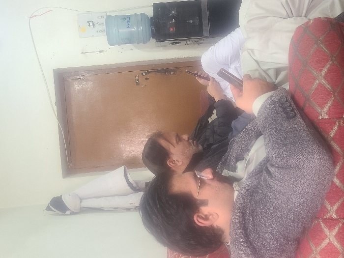 The image displays an indoor scene in Quetta City Tehsil, Pakistan, featuring two adult males seated on a red upholstered sofa with a patterned design