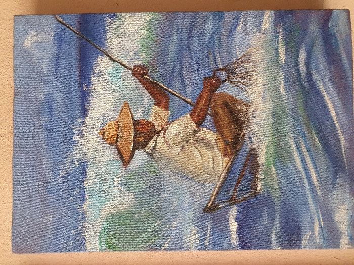 The image is a vertical painting on canvas depicting a lone fisherman in a small, dark-hulled canoe on turbulent waters