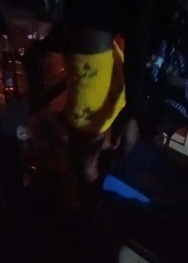A person wearing a black top and yellow shorts with images of palm trees is seen standing in a dimly lit, crowded environment that appears to be a bar or event. The person is standing near a table made of bamboo-like material, on which there are bottles and cups. A blue chair is visible in the foreground. Other people are blurred in the background, moving around. The lighting is poor, making it difficult to see details.
