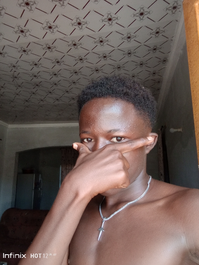 The image displays a young male subject with dark skin and short, dark, curly hair, positioned indoors. He is bare-chested, wearing a silver-colored chain necklace with a metallic dagger-shaped pendant. His right hand is raised to his face, with the thumb and index finger forming a V-shape, partially obscuring his nose and mouth, while the index finger touches the skin near his left eye. His gaze is directed forward. The skin on his forehead and exposed areas appears shiny. The ceiling above features a repeating pattern of dark red-brown lines creating a grid, with each segment containing a four-pointed star design on a white background. In the background, a light-colored wall is visible, with an exposed light bulb fixture on the right. An arched doorway leads to an adjacent room, where a light-colored refrigerator-like appliance and a dark brown upholstered sofa are partially visible. This scene occurs within a residential interior in Rido, Nigeria. A watermark 'Infinix HOT 12 PLAY' is present in the lower-left corner.