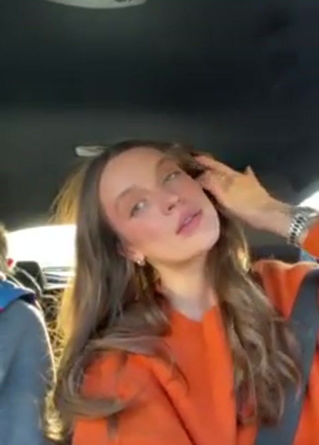 A woman with long brown hair and green eyes wearing an orange sweater is sitting in the passenger seat of a car. She is adjusting her hair and looking at the camera. The interior of the car is visible, with the dashboard and ceiling lights. Another person is partially visible in the driver's seat. Sunlight is shining into the car.