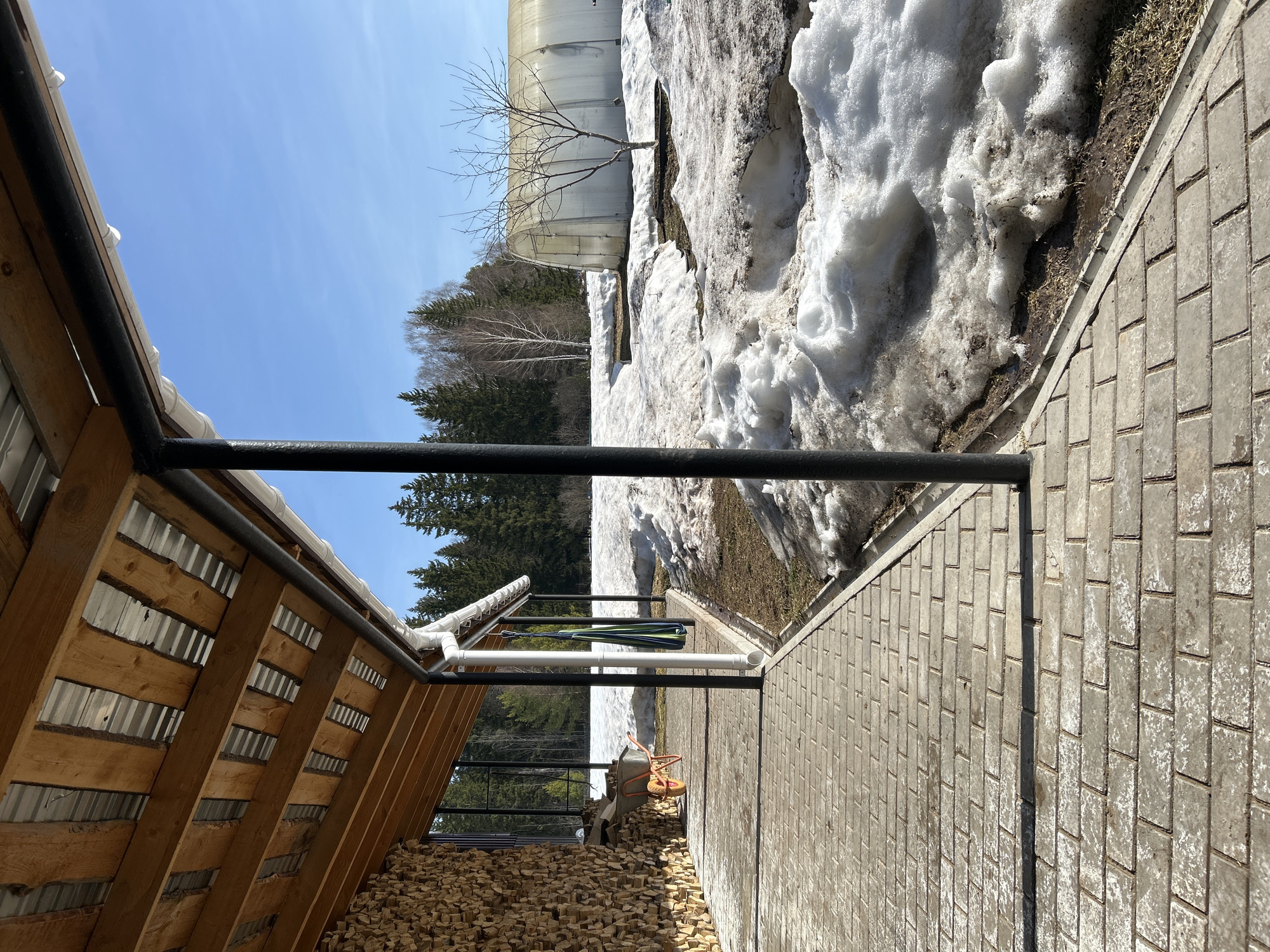 A view from under a roof in Уральское, Russia, shows a paved path alongside snow-covered ground. Firewood is stacked to the left. Beyond a fence, there is a glimpse of a forest. In the distance, a greenhouse can be seen, with a leafless tree nearby. The sky is clear and blue. An upside-down wheelbarrow stands on the path, and umbrellas hang from a pipe.