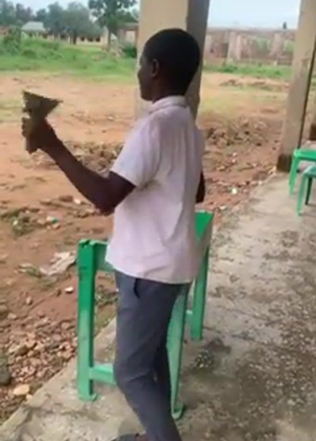 A young person wearing a white shirt and gray pants is standing in front of a green metal chair on a concrete platform. They are holding a metal bell and ringing it. The ground outside the platform is dirt, with some green grass and trees in the distance. There is also a partial view of a building with a roof.