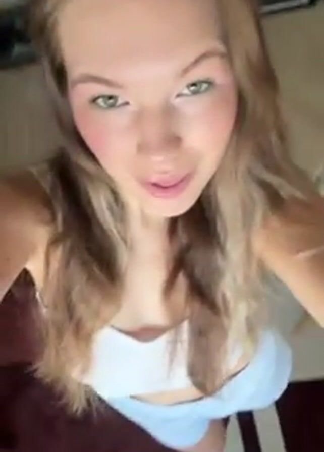 A young woman with light brown hair and light complexion is recording a selfie-style video in a brightly lit room