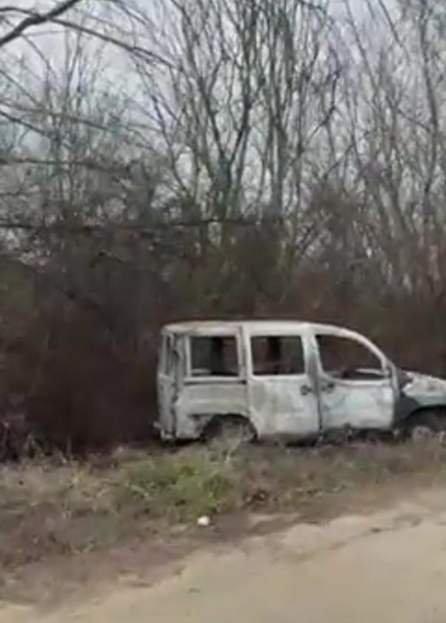 - "charred remains of a white van parked off the side of a dirt road" by FM-3q1Os1, licensed under CC BY 4.0