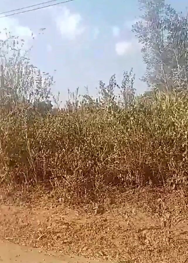 rural scene. A dirt road is visible in the foreground, bordered by dry bushes and tall grass. Beyond the vegetation, there are trees with sparse foliage. A concrete utility pole with power lines stretches across the upper portion of the frame against a blue sky. In the distance, a glimpse of a concrete fence can be seen. The camera seems to be in motion, possibly mounted on a vehicle. A small piece of white trash is visible on the ground near the road.