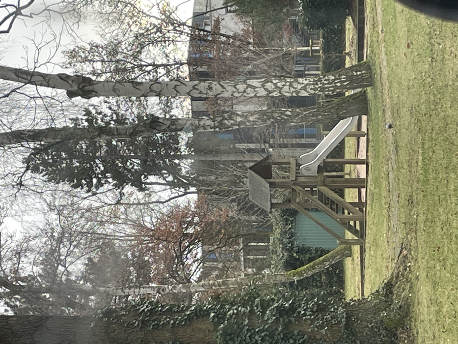 This image depicts a static outdoor scene, likely a communal green space or park, located in the city of Nuremberg, Germany. The primary subject is a wooden playground structure, situated centrally on a grassy area. This structure consists of an elevated platform with a pitched roof, accessed via a wooden staircase, and features a light-colored slide descending from the platform to the ground. The foreground consists of short green grass with visible patches of bare earth. A large tree trunk, heavily covered in dark green ivy, occupies the left edge of the frame. Towards the right, a bare-branched tree with distinctive white-grey bark is partially visible. A small, dark, unidentifiable object rests on the grass in the lower center. The midground and background are densely populated with various trees. Most are deciduous, exhibiting bare branches, indicating late autumn or winter. Some trees with prominent white-grey bark are intermingled with others displaying sparse, reddish-brown foliage. A tall, dark green conifer stands in the right background. Behind the playground, a light green utility box or small shed is partially obscured by foliage. In the far background, several multi-story buildings with visible windows and muted facades are discernible through the tree line, suggesting a residential or institutional periphery. The sky appears overcast, providing diffused illumination to the scene. No individuals are present within the depicted area.