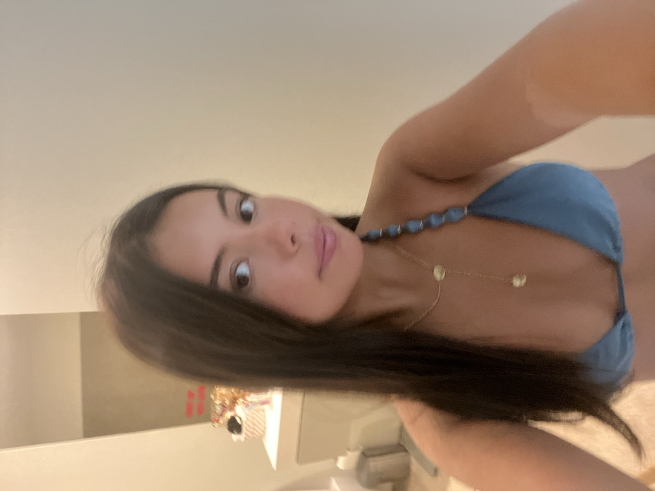 A female subject, appearing to be a young adult, is centered in a close-up, forward-facing selfie, captured from approximately the chest up. She has long, straight, dark brown hair parted in the middle. Her gaze is directed at the camera, and her facial expression is neutral with closed lips. She wears a light blue bikini top, the right strap of which is adorned with a series of light blue, spherical beads. A thin, gold-toned Y-style necklace with two small, circular disc pendants is visible on her chest. The background is an indoor environment characterized by plain, light-colored walls. To the left, a rectangular mirror reflects a partial view of a room. Within the mirror's reflection, indistinct objects are visible on what appears to be a white shelf or surface; these include a small, striped container with dark contents and some shimmering, golden-brown decorative elements. Below the reflected shelf, a blurred, metallic gray cylindrical object, possibly a waste bin or furniture leg, is present. The lighting is bright and uniform. The precise location within Lordelo do Ouro e Massarelos, Portugal, cannot be determined from the visual evidence provided.