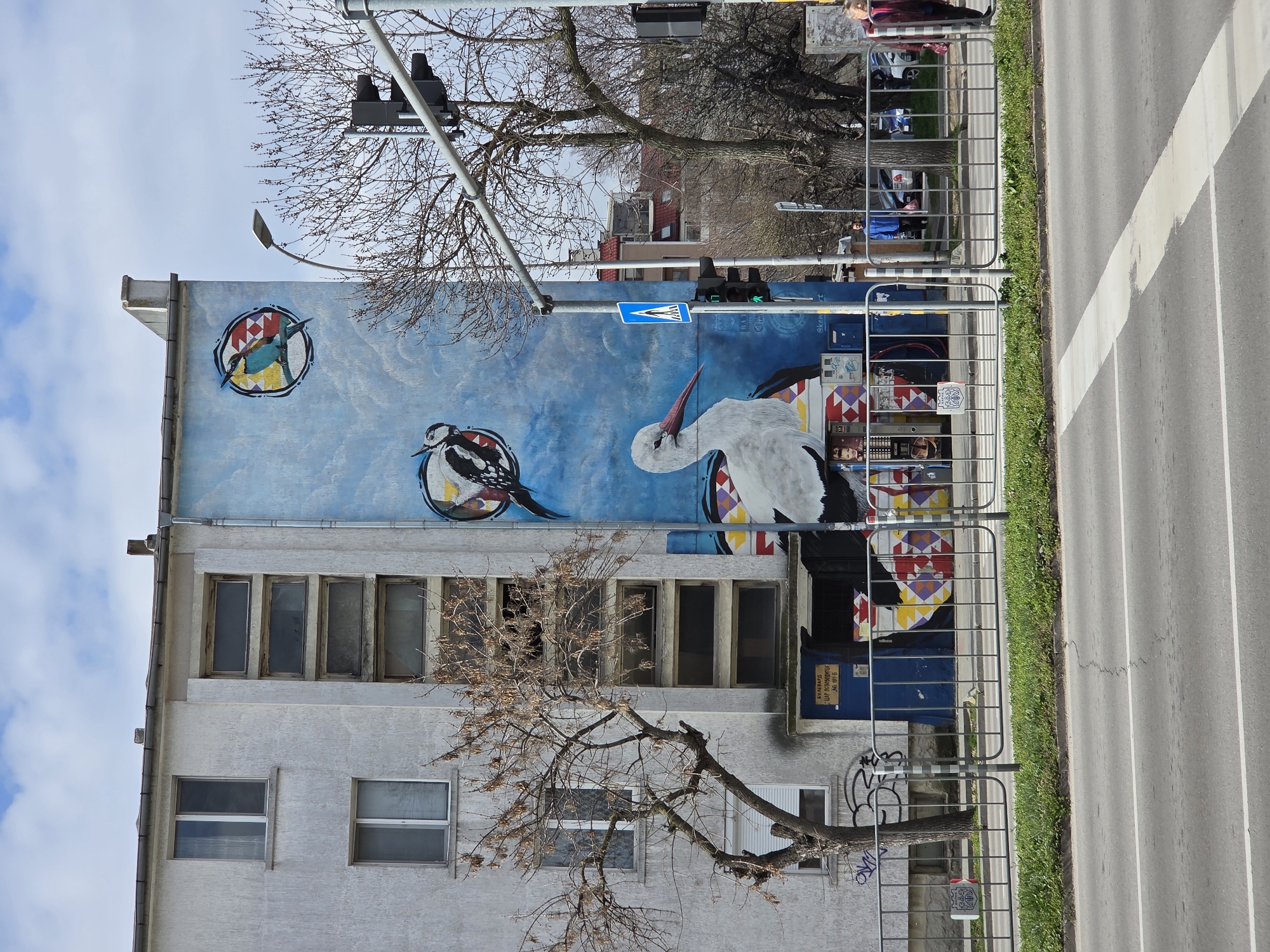 A street-level shot shows a four-story building with a large mural on its side, located in Varna, Bulgaria. The mural features three bird illustrations against a blue background: one resembling a stork and two smaller birds, all encased within circles. The building is gray, with rectangular windows across its levels. A bare tree branch extends from the lower section of the building. A metal fence runs along the sidewalk, partially obscuring the mural at street level. Behind the fence, there is a glimpse of people and parked cars. The foreground shows a section of a paved road with white lines marking lanes. Traffic lights and utility poles are visible in the upper part of the frame.