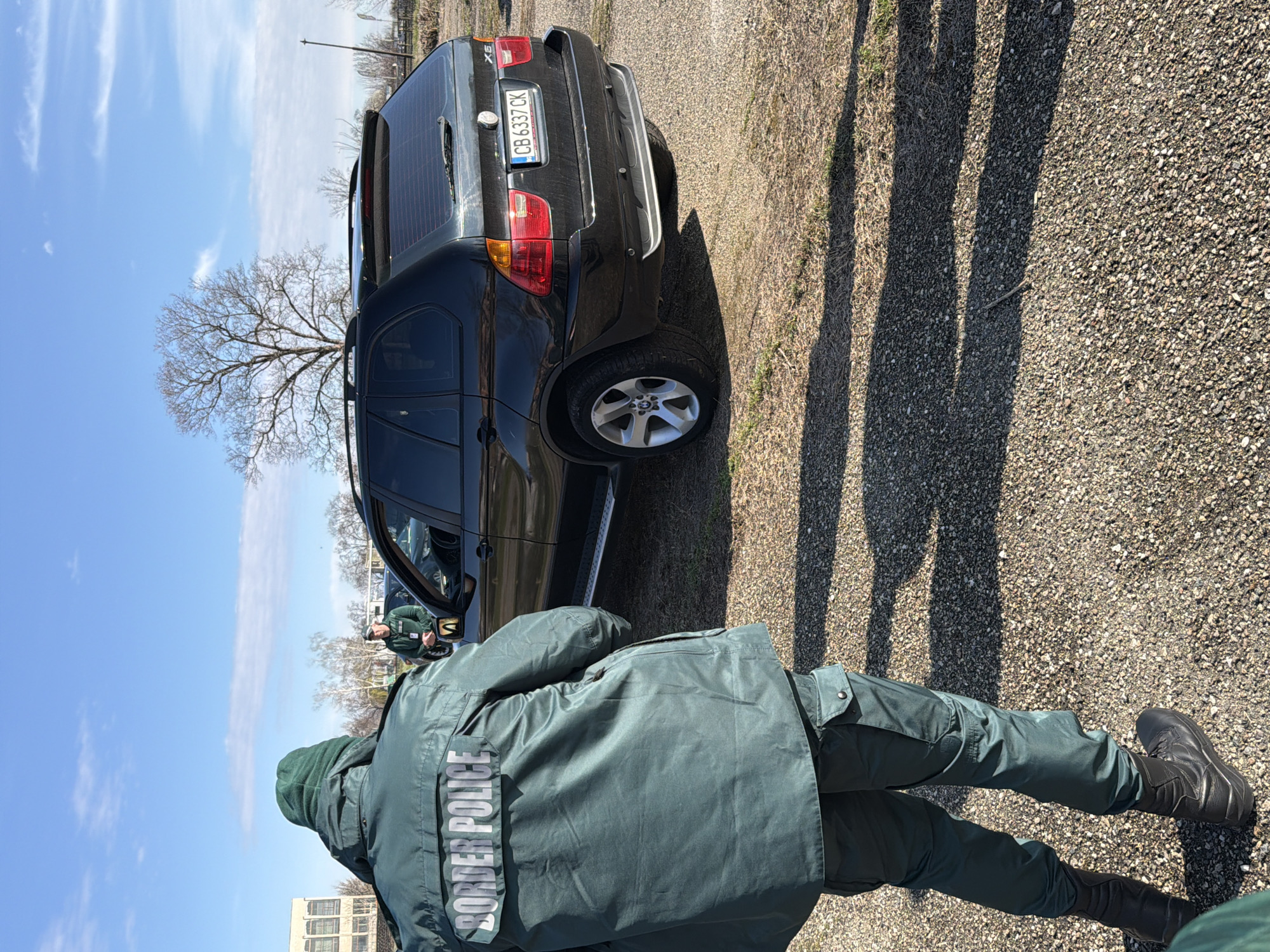 A border police officer stands near a black BMW X5 SUV with license plate CB 6337 CK in a gravel area