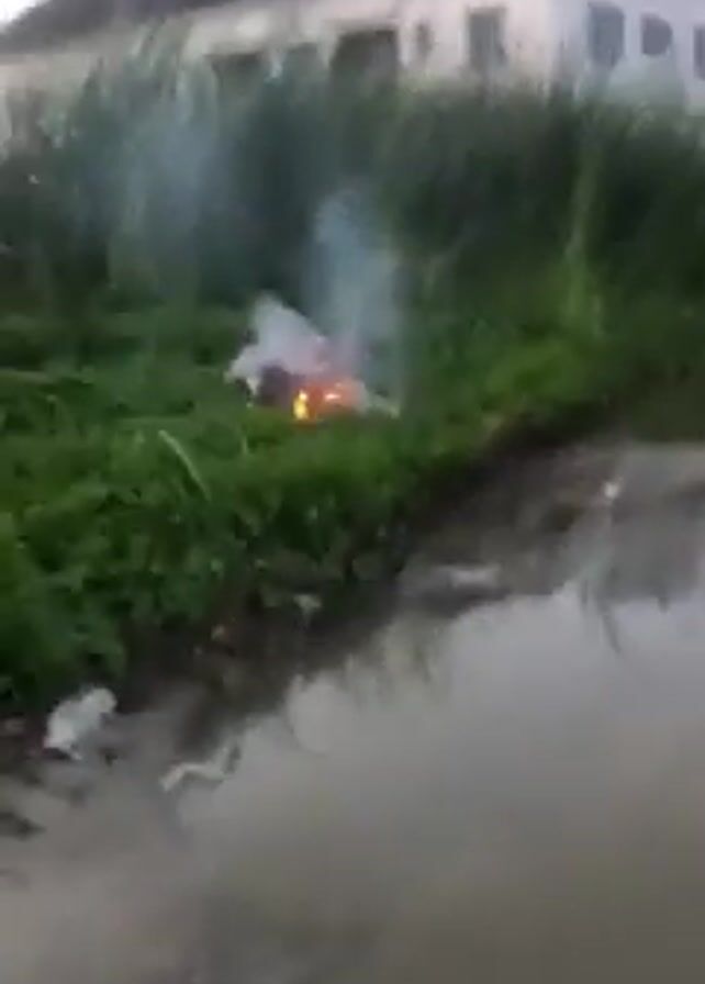 A small fire is burning in a grassy area beside a muddy shoreline. Smoke rises from the flames. Tall reeds grow behind the fire. A white house with a dark roof is visible in the background. Debris litters the edge of the water. The camera is slightly shaky.