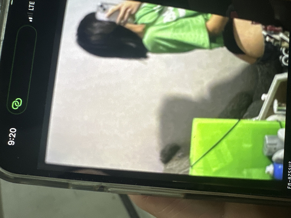 The image displays a mobile phone screen held by a human hand, showcasing a reflected scene. The phone screen indicates the time "9:20," a green chain link icon, and a partially visible "LTE" signal. The phone is encased in a clear protective cover. The image displayed on the phone screen features a person from the mid-torso to the upper thighs, observed from behind and slightly to the side, looking over their left shoulder. The individual has dark, shoulder-length hair and is wearing a light green t-shirt and dark-colored underwear, with a portion of the buttocks exposed. They are holding a white mobile phone in their right hand, which is partially obscured by their hair and body, suggesting they are taking a mirror selfie. The background of the displayed image appears to be an indoor setting with a light-colored wall. To the left of the person, a bright neon-green rectangular object is visible, with a dark strap or cable running diagonally across it. Below this object are several smaller items, including a blue and white spray can and other silver-toned containers. A shadow is cast on the wall to the left of the person. The hand holding the primary phone is a light-skinned adult hand. The specific location in Yerevan, Armenia, cannot be determined from the visual information provided in the image.