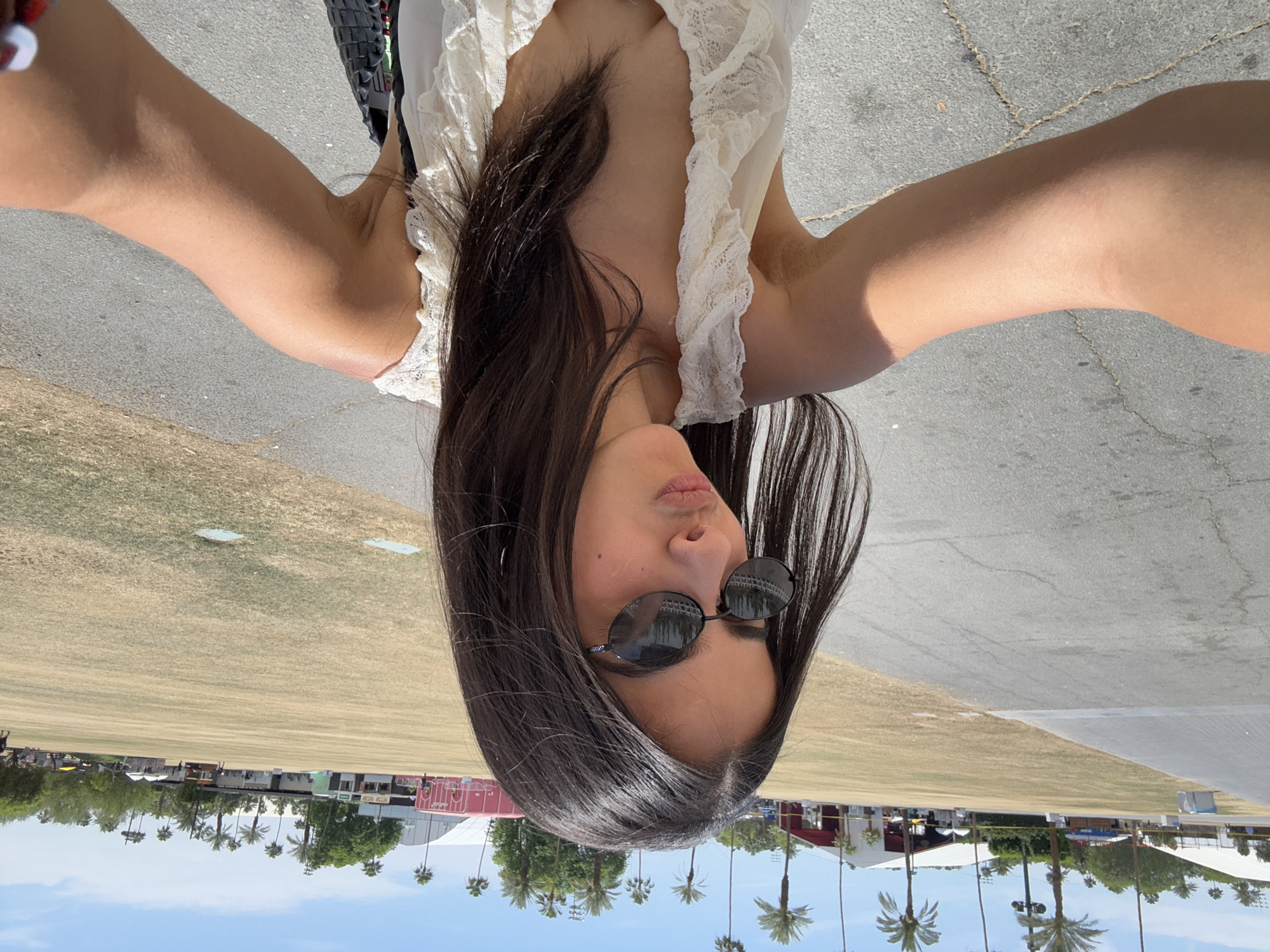 A selfie of a female in the city of Indio, California, USA. She is wearing a white top with lace and round sunglasses. Behind her is a grassy field, buildings, and palm trees. The sky is light blue. A gray asphalt road is visible in the upper half of the picture.