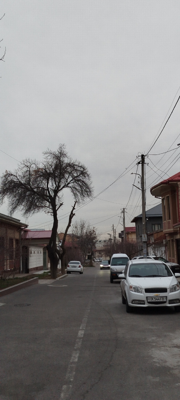 The image displays an urban street scene in Tashkent, Uzbekistan, under an overcast sky, indicative of late autumn or winter. The asphalt road, marked with a faded dashed white centerline and a manhole cover on the left, extends into the background. On the right side of the road, a white Chevrolet sedan is visible in the foreground, facing the viewer. Its Uzbekistan license plate, "01 K 544 FB," is clearly discernible. Behind it, a white compact van is parked, facing away. Further down the street on the left, a white sedan is parked parallel to the curb. Multiple other vehicles are visible in the distant background. A large, leafless deciduous tree with a wide, gnarled canopy dominates the left mid-ground. Smaller bare trees and shrubs line both sides of the street. Buildings flank the road. On the right, a multi-story structure with a reddish-brown facade and a red tile roof features an octagonal corner section. On the left, a building with a light-colored facade and a red roof is partially visible behind a low white wall. Numerous utility poles with a complex network of overhead power and communication lines, along with attached streetlights, are prominent on both sides of the street, particularly on the right. No individuals or specific human actions are visible in the scene.