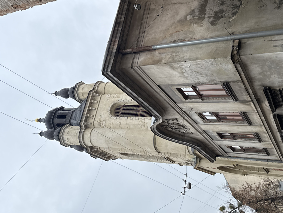 This image captures an architectural view of the Church of the Transfiguration (Преображенська церква) in Lviv, Ukraine, viewed from an oblique angle