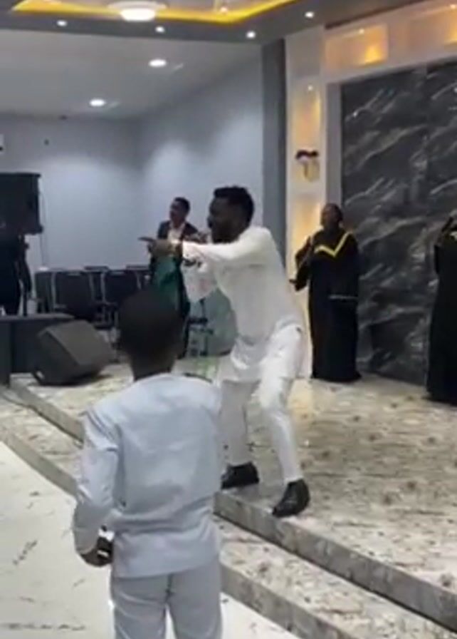 man in a white suit and black shoes singing and dancing in what looks like a church or event hall. He holds a microphone in one hand and gestures with the other. Behind him, a group of people in black robes appear to be a choir, with some singing along. Another man in a suit stands in the background. In front of the singing man, a boy in a white outfit stands watching him. The room has modern décor with marble floors and a decorative ceiling. There are speakers and chairs visible on the side.