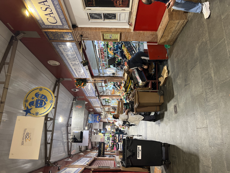 The image captures an interior view of an aisle within the Mercado de Triana in Sevilla, Spain