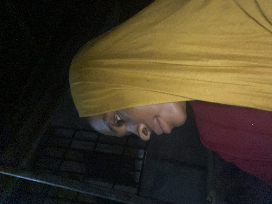 A dimly lit, close-up, side-profile portrait of a person, reportedly located in Adankolo, Nigeria. The subject's left facial profile is visible, featuring dark skin, a discernible left eye gazing towards the upper right, a prominent nose, and full lips exhibiting a subtle upward curve. A dark red garment is visible on the subject's body, beneath a mustard yellow fabric head covering that drapes over the head and shoulders, obscuring the right side of the face and much of the upper torso. The background is dark, with faint, indeterminate vertical and horizontal lines suggesting a structural element, possibly a grate or window, in the upper left. No specific actions or interactions are evident; the subject is in a static pose.