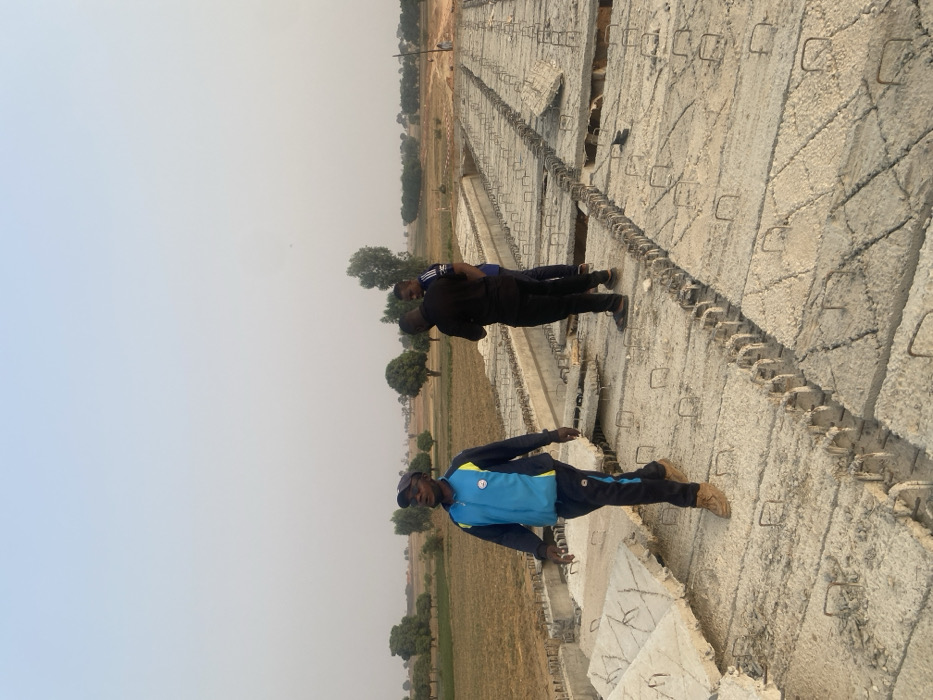 Three men stand on concrete slabs. The person in the foreground wears a blue and black track suit. Two other men are behind him, one in black. The slabs appear to be part of some infrastructure construction, possibly for erosion control. The background shows a flat, arid landscape with sparse vegetation and a hazy sky.