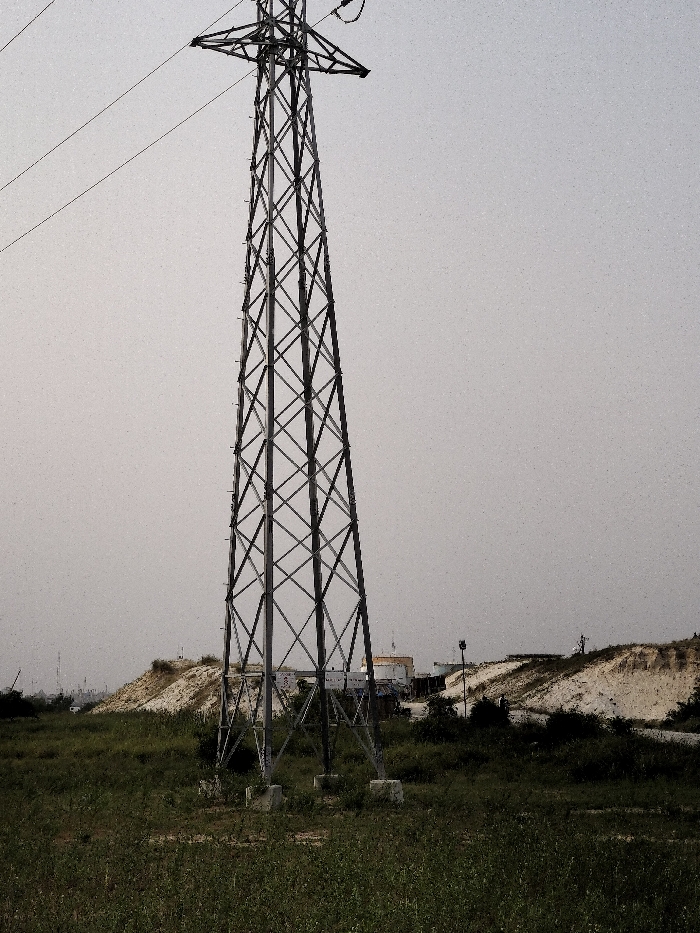 An electrical transmission tower stands tall against a hazy gray sky. Wires extend from its apex. The tower rests on a grassy field, flanked by low sand hills and some scrub vegetation. A small building and a few pieces of industrial equipment are partially visible in the distance behind the hill on the right, adding to the industrial landscape. The photo appears to be shot on a bright but overcast day.