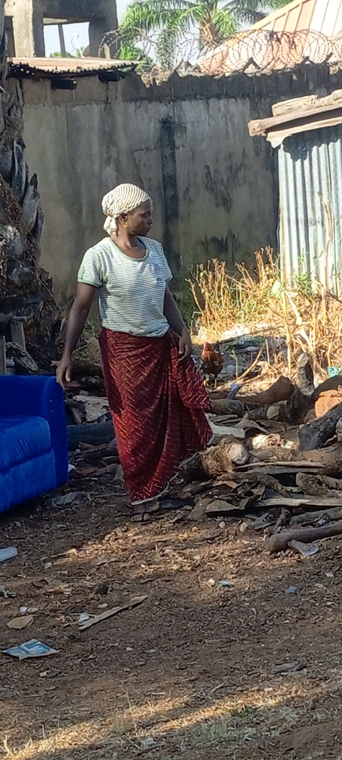The image depicts an outdoor scene in Kachia, Nigeria. An adult female, with dark skin, stands slightly right of center, looking towards the right. She wears a light-colored striped short-sleeved shirt, a patterned dark red wrapper, and a light-colored striped headscarf. Gold-colored hoop earrings are visible on her ears, and she wears dark sandals. Her right hand rests near a blue upholstered furniture piece, likely a sofa or chair section, positioned on the far left. The ground is unpaved dirt, extensively covered with dry leaves, wood fragments, and assorted debris. In the mid-ground, to the right of the woman, a brown chicken walks towards the right. The background features various structures: a light-colored concrete wall with an open window frame is visible, partially obscured by a dark, possibly dead tree trunk on the left. Another section of wall is topped with corrugated metal roofing and a coil of barbed wire, with a corrugated metal shed-like structure further right. Sparse dry vegetation and palm fronds are also visible in the background. The scene is brightly lit by daylight, casting clear shadows.