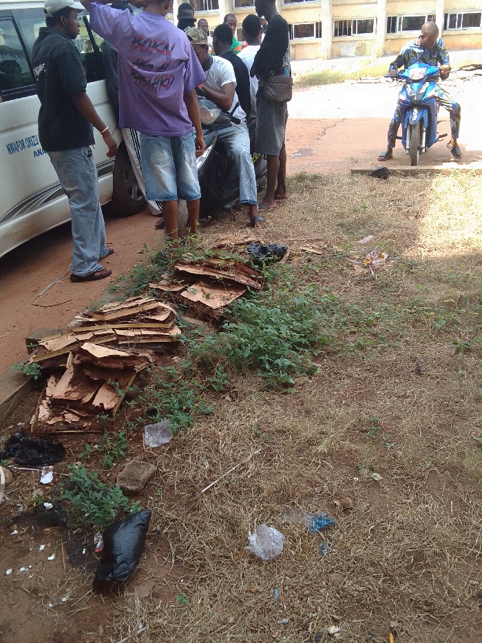 The scene, located in Ukwu-Abwa, Nigeria, depicts an outdoor area under clear daytime conditions. The foreground consists of dry, brown grass interspersed with patches of green weeds and exposed reddish-brown soil. A prominent pile of deteriorated, layered cardboard or plywood fragments is situated in the lower-left. Various pieces of litter, including black plastic bags, clear plastic bottles, and paper scraps, are scattered across the ground. In the midground, a group of approximately seven men is observed near a white minivan and two motorcycles. On the far left, the driver's side of a white minivan, bearing partial text "NWAFOR ORUZU AM...", is visible. A man wearing a light green cap, black t-shirt, and blue jeans stands beside the minivan. Adjacent to him, a man in a purple t-shirt and denim shorts stands with his right arm raised, facing away from the camera. Another man in a white t-shirt and blue jeans is seated on a dark-colored motorcycle positioned within this cluster of individuals. Further to the right, a man in a patterned long-sleeve shirt and dark trousers is seated on a blue and black motorcycle, facing left. The background features a light-colored, multi-story building with a series of rectangular windows, suggesting an institutional or administrative structure. A dirt road or open area is visible between the group of people and the building.