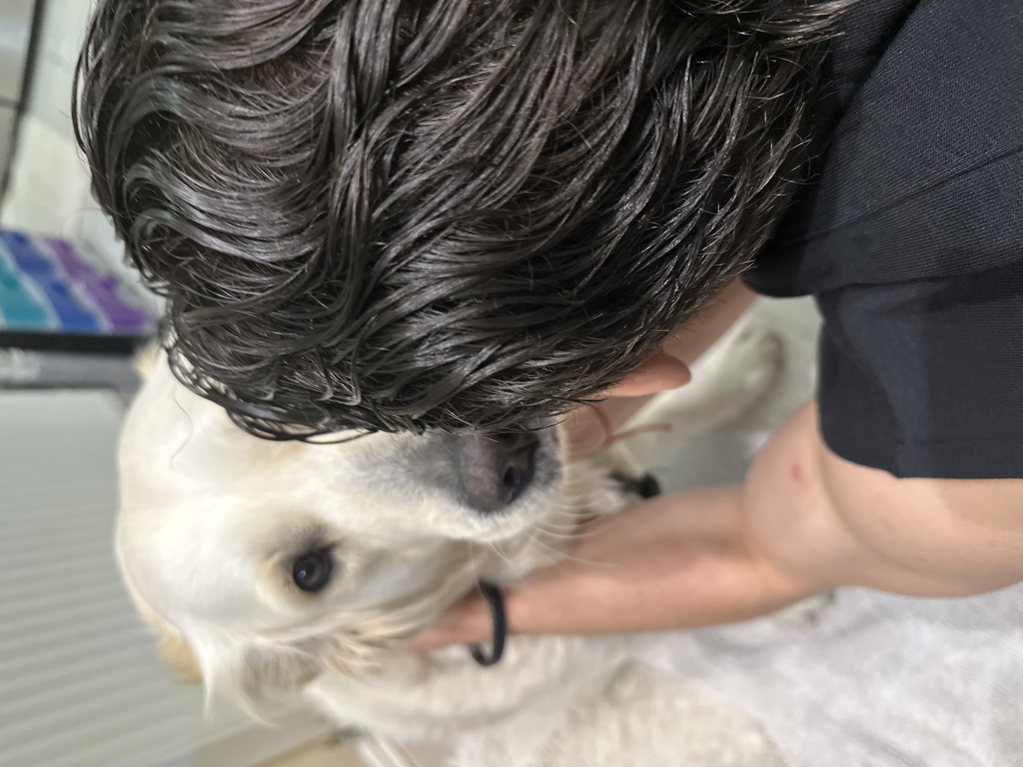 The image depicts an indoor scene featuring a cream-colored Golden Retriever dog in close physical interaction with a person. The individual is viewed from behind, displaying dark, wet, wavy hair and wearing a black long-sleeved garment. Their right arm, adorned with a black band on the wrist and a small reddish mark on the inner elbow, extends around the dog's neck and upper chest. The Golden Retriever, with light cream fur, dark eyes, and a black nose, faces towards the viewer, its tongue slightly visible. A white or light-colored textile underlays the subjects. The background consists of blurred light-colored walls and indistinct objects showing blue and purple tones. There are no visual cues within the image to confirm the location as London, United Kingdom.